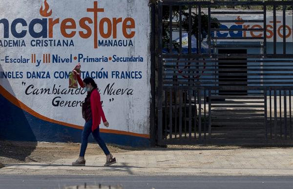 Un mujer camina frente a la puerta cerrada de una escuela hoy en Managua (Nicaragua). Foto: EFE