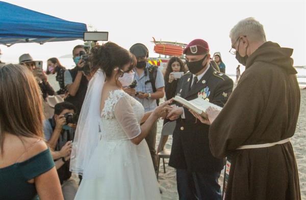 La boda ocurrió dos días después de que cientos de migrantes protestaran en Tijuana en demanda de atención a sus solicitudes de refugio en Estados Unidos, retrasadas por la pandemia de COVID-19.