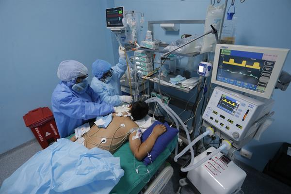 Trabajadores sanitarios atienden a un paciente con covid-19 en una de las Unidades de Cuidados Intensivos del Hospital Alberto Sabogal, en el Callao (Perú). EFE