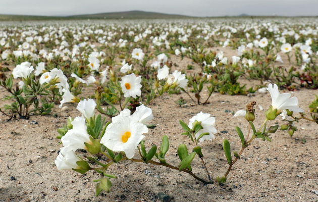 Las intensas y sorpresivas precipitaciones registradas en las regiones del norte de Chile durante los meses del invierno austral dieron paso al deslumbrante desierto florido en Atacama, el más árido y soleado del mundo. Este fenómeno, que ocurre con una distancia de cinco o siete años, pero que se ha vuelto recurrente debido a la presencia de el fenómeno climatológico El Niño, atrae a miles de turistas con sus más de 200 especies florales y fauna endémica. Algunos expertos apuntan que este 2017 podría apreciarse el más espectacular florecimiento de las últimas décadas, debido a la cantidad de agua caída en la zona norte, que permitió un desarrollo de vegetación "intenso y denso", explicó la Corporación Nacional Forestal (Conaf). "Esto puede o no ser, eso depende de las condiciones atmosféricas, de un aumento de la temperatura gradual mientras vaya pasando el invierno y acercándose la primavera", señaló el jefe de Conservación de la Biodiversidad de Conaf, César Pizarro. Pizarro precisó que las lluvias de mayo en la región de Atacama, principalmente en la provincia de Huasco, casi al límite con la región de Coquimbo, propiciaron el surgimiento de la alfombra multicolor. "Un mes después cayeron (las lluvias) en Antofagasta y Chañaral, lo que marca un período. Ya en octubre vamos a tener una floración no con la alta intensidad ni densidad, pero sí muy interesante que convierte quebradas, lomas y serranía de roca y tierra, en lugares verdes con flores", sostuvo el también biólogo. El desierto florido es sin duda una de las postales más apreciadas por los turistas que acuden a las regiones del extremo norte por estos meses, un atractivo que aún no termina de entenderse y que la ciencia no ha podido explicar a cabalidad. Nolanas de color celeste y lila, coloridas patas de guanaco, delicadas añañucas y las locales garras de león se divisan al borde del camino en el recorrido entre Copiapó y Vallenar, a unos 665 kilómetros de Santiago. Este "milagro del desierto", como lo llaman algunos lugareños, es aprovechado por los comerciantes y la oferta turística para promover otras bondades y atributos del territorio, que cuenta con parques nacionales, mares cristalinos, paisajes privilegiados y áreas naturales protegidas. De acuerdo con el Servicio Nacional de Turismo (Sernatur), el inusual florecimiento se verá en su máximo esplendor entre la segunda semana de agosto y la primera quincena de septiembre, por lo que han llamado a los visitantes a planificar sus viajes. El Sernatur declaró que espera unas 25,000 visitas para este año, mientras contabiliza un aumento de las consultas recibidas en un 25%, respecto de 2016. Existen solo tres lugares en el mundo donde los clásicos desiertos florecen, que son Estados Unidos, Australia y Chile. La región de Atacama, que se dio a conocer mundialmente en 2010 cuando 33 mineros quedaron atrapados bajo tierra hasta ser rescatados 71 días después, figura en la guía de viajes Lonely Planet como uno de los 10 destinos para visitar. Hace 40 años, el desierto de Atacama también fue destacado por los supuestos avistamientos de Ovnis, en que incluso un cabo del Ejército de Chile, fue abducido por un nave espacial, un hecho que nunca desmintió la institución y que sirvió para que miles de turistas llegaran a la zona en la década de los ochenta.