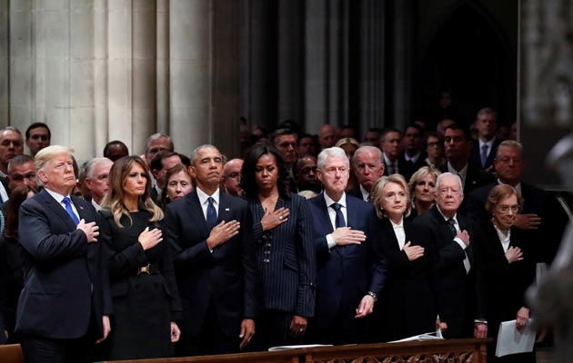 La congregación, en la que se encontraban gobernantes extranjeros y diplomáticos, estadounidenses de puestos jerárquicos y otros que estuvieron relacionados con el difunto, se puso de pie al arribo del féretro, acompañado por clérigos de distintas confesiones. En la fila que ocupaban, el presidente Donald Trump, los expresidentes Barack Obama, Jimmy Carter y Bill Clinton, junto con sus cónyuges, pusieron la mano sobre sus corazones.