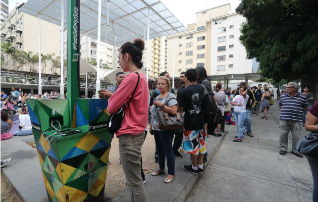 Personas hacen fila para recargar la batería de sus teléfonos móviles en un punto público durante el apagón eléctrico en Caracas. Foto: EFE.