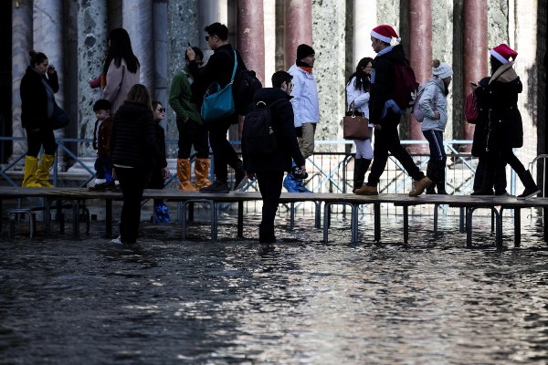 Venecia vuelve a sufrir el fenómeno del agua alta, que alcanzó un pico de 144 centímetros y cubrió el suelo del 60% del casco histórico, aunque sin que se cumplieran las previsiones que advertían de una marea de hasta 150 centímetros.