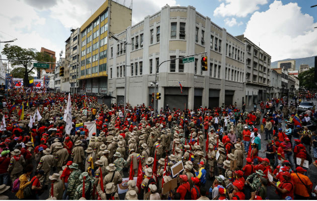 En la manifestación que recorrió el centro de Caracas hasta llegar al palacio presidencial de Miraflores, participaron los miembros de la milicia de Venezuela, trabajadores públicos e integrantes de los movimientos sociales del chavismo.