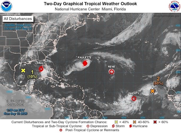 Paulette, convertido en huracán en las últimas horas del sábado en el Atlántico norte, avanza hacia las Bermudas con vientos de 80 millas por hora (130 km/h) que podrían aumentar, mientras que la tormenta Sally continúa este domingo rumbo a Misisipi, Luisiana o Alabama (EE.UU.) sobre el Golfo de México y tras afectar Florida.
