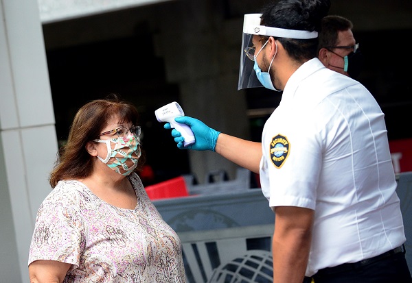 Un agente de seguridad de Universal Studios mide la temperatura a una señora que ingresa a dicho parque temático en Orlando, Florida (EE.UU).