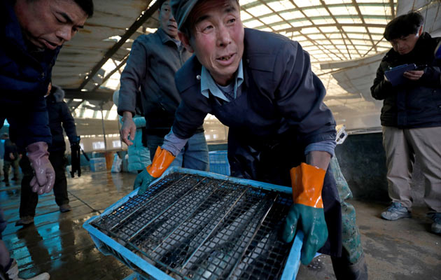 Del agua a las cubetas, de allí a la báscula, luego a unas cajas con separadores especiales y de ahí a la furgoneta, rumbo a los restaurantes pequineses, donde son carne de cazuela.