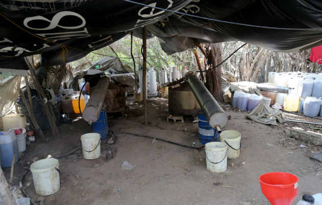 Para pasar desapercibidos entre los árboles y la maleza, los dos laboratorios clandestinos estaban cubiertos con carpas de color café y hojas de palma secas.