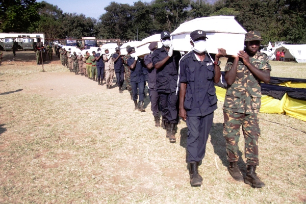 La policía y los oficiales del ejército llevan ataúdes para ser colocados para que los vean sus familiares, en Morogoro, FOTO/AP
