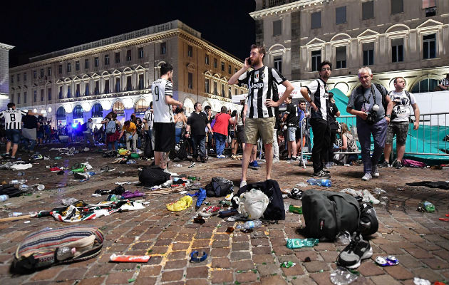 Cinco personas resultaron heridas gravemente y unos 400 sufrieron lesiones leves el sábado como consecuencia de una estampida, provocada por una falsa alarma, que sembró el pánico en Turín, donde estaban reunidos los hinchas del Juventus para ver la final de la Liga de Campeones.