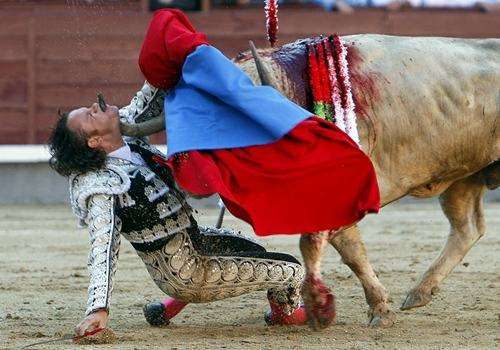 El torero español Julio Aparicio, resultó herido muy grave hoy en la plaza de toros de Las Ventas de Madrid, con una cornada en el cuello que le asomó por la boca afectándole a la lengua, el paladar y el maxilar superior.