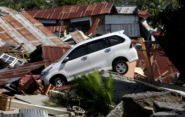 Un coche es visto sobre las ruinas de una casa tras el terremoto y posterior tsunami en Indonesia. EFE