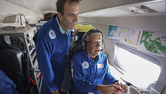 Los meteorólogos John Kaplan y Jack Parrish ven la transmisión de datos en su estación de trabajo, a bordo del jet de llamada Gulfstream IV NOAA-49 de NOAA, una plataforma de alta tecnología, de alto vuelo y alta velocidad utilizada para la previsión e investigación de huracanes. FOTO/AP