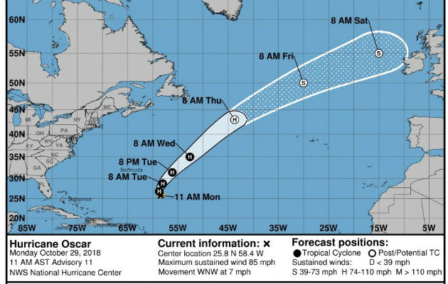 Imagen cedida por el Centro Nacional de Huracanes (NHC) de EE.UU. que muestra el pronóstico de cinco días del huracán de categoría 1 Óscar.
