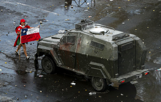 Un manifestante enfrenta con una bandera a un vehículo blindado en Santiago. Foto: AP.