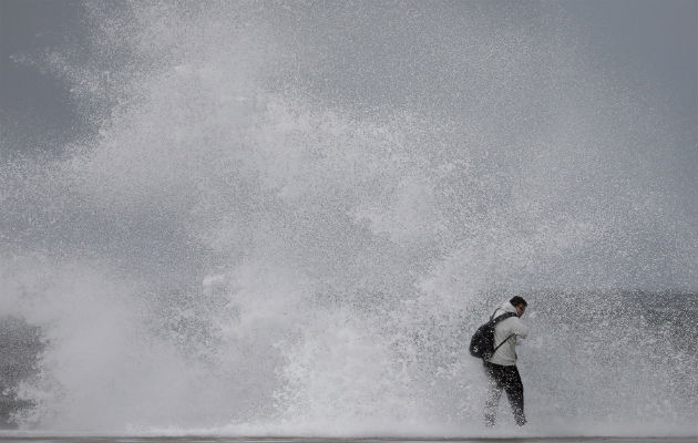 Un ciudadano desafía el fuerte oleaje en la playa de Barceloneta, durante el temporal marítimo que afecta a toda la costa catalana lo que ha obligado a activar la alerta naranja. Foto: EFE