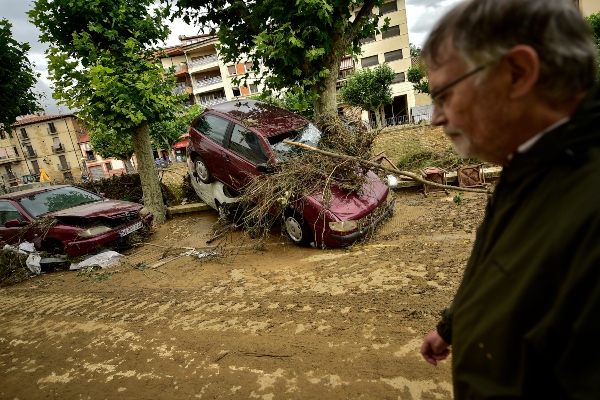Los residentes caminan en la calle junto a los autos dañados después de las fuertes lluvias en Tafalla, en el norte de España. FOTO/AP