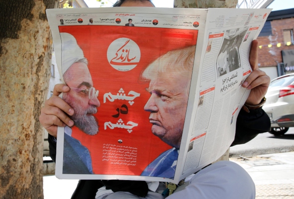 Un iraní lee el diario "Sazandegi", que lleva a portada una foto de los presidentes iraní Hasán Rohaní (izq) y estadounidense, Donald Trump, este martes en Teherán (Irán). Irán cerró hoy filas en torno a los Guardianes de la Revolución, designados por Washington grupo terrorista, y advirtió a Estados Unidos de las peligrosas consecuencias de esta decisión sin precedentes. FOTO/EFE