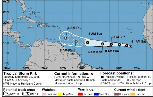 Aunque se pronóstica un debilitamiento gradual en los próximos dos días, Kirk va a atravesar las Antillas Menores y la parte oriental del Mar Caribe como tormenta tropical, advirtió el NHC.