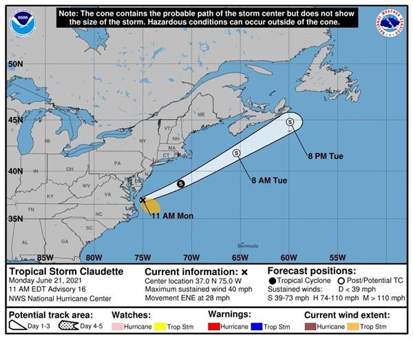 La tormenta tropical Claudette continúa este lunes alejándose de la costa estadounidense en su rápido desplazamiento hacia el noroeste del Atlántico y se espera que se convierta en un sistema 'postropical' el martes, informó el Centro Nacional de Huracanes (NHC) de EE.UU.