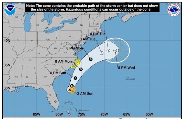 La agencia federal, con sede en Miami (EEUU), emitió un aviso de tormenta para la costa de Carolina del Norte desde Surf City hasta Duck, como también Pamlico y Albemarle Sounds.