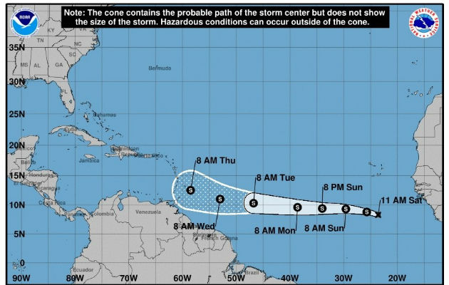 A las 11.00 hora local (15.00 GMT), la tormenta, cuyo centro fue ubicado cerca de la latitud 8,3 Norte, longitud 23,6 Oeste, presentaba una velocidad de traslación de unos 22 kilómetros por hora (14 millas por hora) y se espera que avance hacia el noroeste a una velocidad similar a lo largo de esta noche.