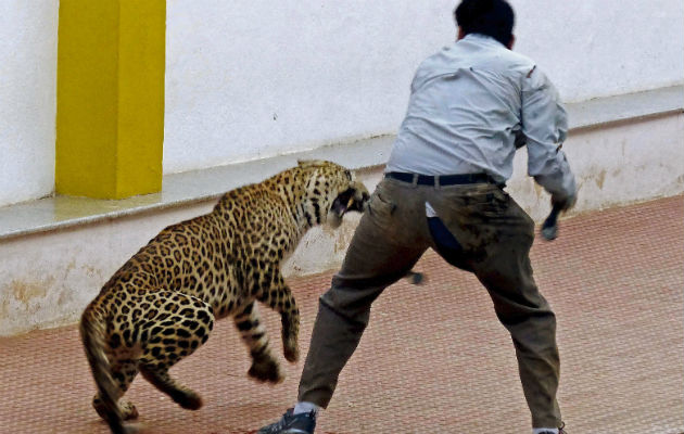 Un leopardo que estaba merodeando en una escuela en el sur de India hirió a tres personas cuando trataban de atraparlo, informaron las autoridades. Una multitud de curiosos que incluían reporteros de televisión atestiguaron la persecución, la cual duró varias horas hasta que los trabajadores forestales dispararon un dardo tranquilizador al animal el domingo en la noche. La agencia de noticias Press Trust of India informó que las autoridades escolares dijeron que vieron por primera vez al leopardo en circuito cerrado de televisión en la escuela privada Vibgyor en Bangalore, y después desapareció entre algunos arbustos cercanos. El enorme gato trepó una pared para volverse a meter a los terrenos de la escuela. Atacó e hirió a tres personas, entre ellas un veterinario y un hombre que trató de subirse a una reja para escapar. La policía informó que fueron enviados al hospital para ser atendidos.