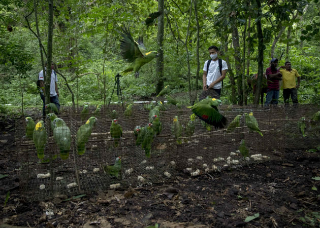 Varias loras vuelan tras ser liberadas en su hábitat natural en Chinandega (Nicaragua). Fotos: EFE..