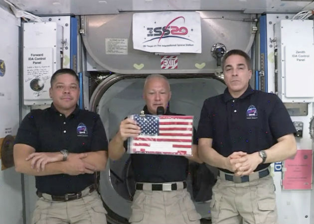 Imágenes suministradas por la NASA mostraron este lunes a los astronautas Robert L. Behnken y Chris Cassidy junto al comandante Douglas Hurley portando la bandera estadounidense dentro de la Estación Espacial Internacional (EEI).