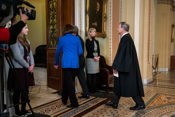 Como estipula la ley, el presidente del Tribunal Supremo, el juez John G. Roberts, juró como jefe de la Cámara Alta, en sustitución del vicepresidente Mike Pence, durante el juicio político.