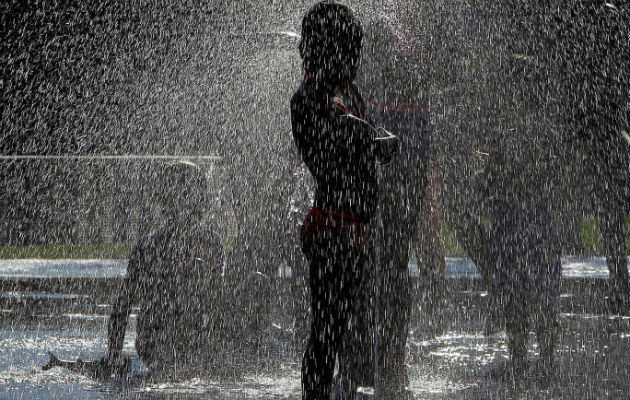 Varios niños juega con los chorros de agua para refrescarse en el parque "Madrid Río". FOTO/EFE
