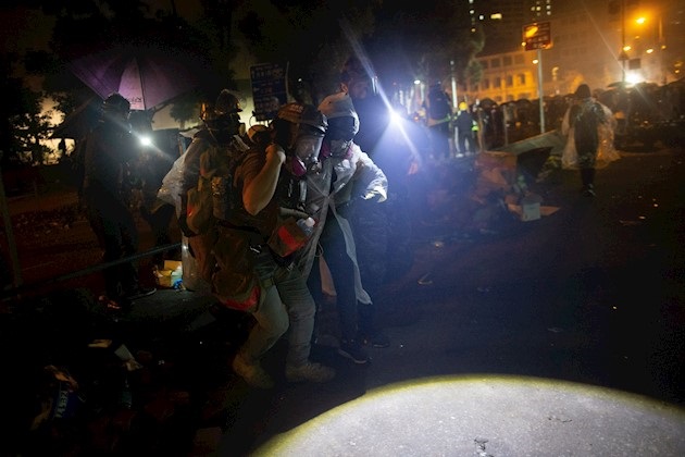 Los manifestantes avanzaron hacia la policía desde fuera del perímetro mientras otros salían del campus, enarbolando sus emblemáticos paraguas. En algunos lugares, la policía intervino para reducir a manifestantes y hacer detenciones.