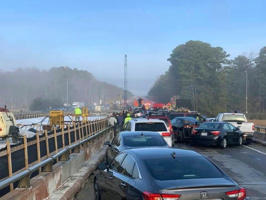 "Niebla y hielo en el puente Queens Creek a las 7:51 a.m. cuando comenzaron los choques", detalló la Policía, tras confirmar que están investigando las causas del enorme atasco.