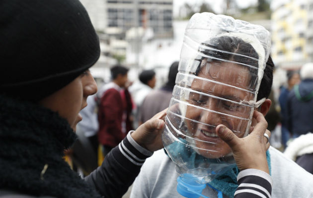 César Viteri, que se define como un ecuatoriano que quiere apoyar a la lucha, encontró un oficio altruista en medio de las manifestaciones en Quito: Confecciona a mano máscaras antigases con botellas de agua recicladas, un poco de vinagre, cinta adhesiva y bronca contra las medidas económicas aplicadas por el Gobierno.