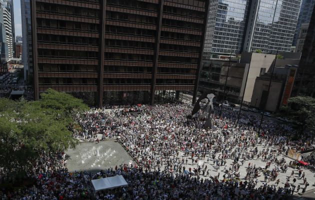 La multitud partió en silencio con su protesta a través del centenario Brooklyn Bridge hasta el edificio que alberga la corte federal, en Brooklyn, desafiando el calor que se sintió hoy en la ciudad y como parte de unas 700 protestas que se realizaron a través del país.