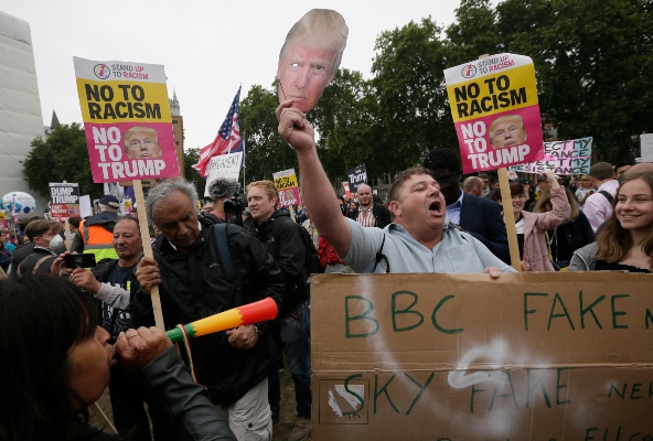 "Donald Trump is not welcome here" (Donald Trump, no es bienvenido aquí) es el grito que lanzaron decenas de miles de personas en el centro de Londres, para emitir un inequívoco mensaje de repulsa al viaje de Estado del presidente de Estados Unidos al Reino Unido.