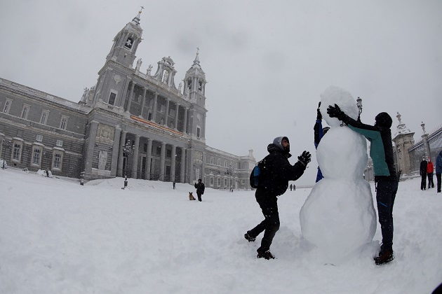 Personas hacen hoy un muñeco de nieve en las inmediaciones de la Catedral de la Almudena , en Madrid. Foto: EFE