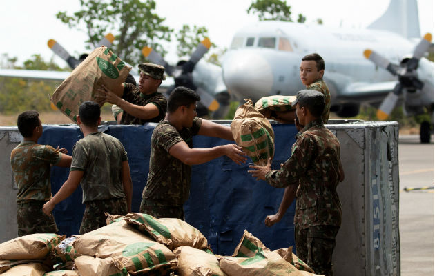 Soldados brasileños organizan un cargamento con ayuda humanitaria destinada para Venezuela, este viernes, en Boa Vista (Brasil). Foto: EFE.