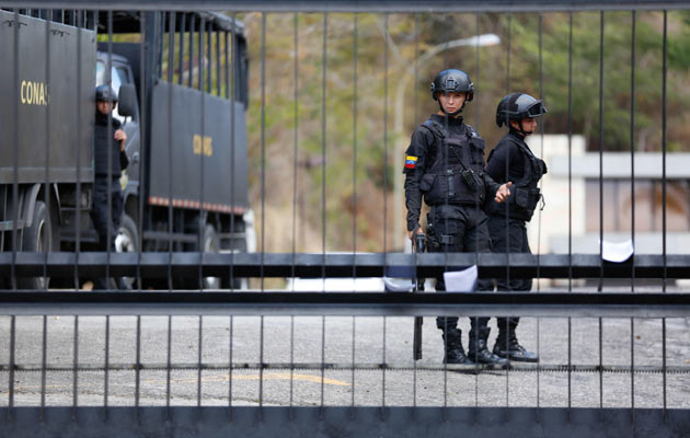 Militares resguardan la instalación militar del Comando Nacional Anti Extorsión y Secuestro (Conas) mientras opositores llegan para hacer entrega de la Ley de Amnistía. FOTO/EFE
