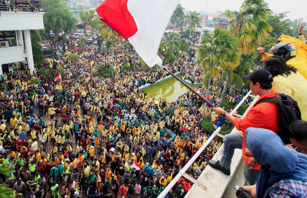 Los estudiantes ocupan el parlamento local durante una manifestación en Padang, Sumatera Occidental, Indonesia. FOTO/AP