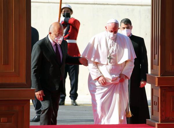 El papa fue recibido al pie de la escalera del avión por el primer ministro, Mustafa al Kazemi, a quien estrechó la mano y dos niños con trajes tradicionales le ofrecieron flores.