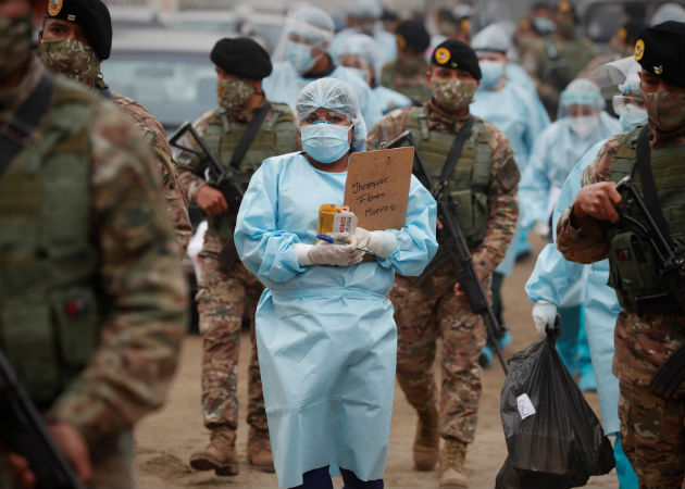 Personal sanitario apoyado por militares del ejército realizan pruebas de COVID-19 a los pobladores del Asentamiento Humano Pampa Los Olivares-Villa Leticia de Cajamarquilla, en Lima (Perú). EFE/Paolo Aguilar