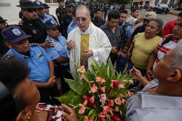 El padre Edwin Roman intenta convencer a la policía de que permita que parientes de manifestantes antigubernamentales encarcelados y muertos ingresen a la Iglesia de San Miguel Arcángel en Masaya. FOTO/AP