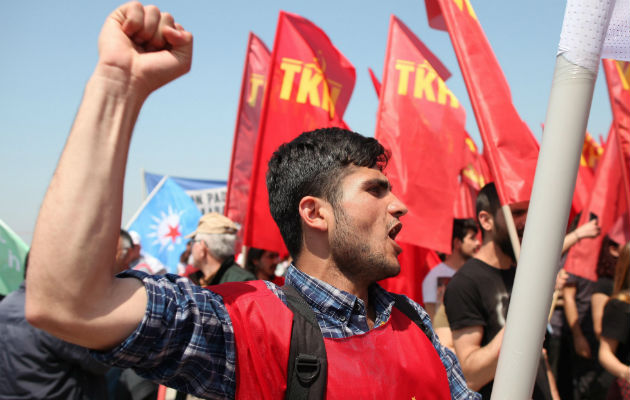 Trabajadores turcos gritan consignas durante una marcha hacia la plaza de Taksim, por el Día del Trabajador. FOTO/EFE