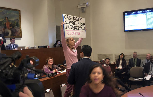 La activista Medea Benjamín con el grupo Code Pink, interrumpe los comentarios del secretario de Estado Mike Pompeo durante una sesión extraordinaria sobre la crisis en Venezuela celebrada por la Organización de los Estados Americanos,. FOTO/AP