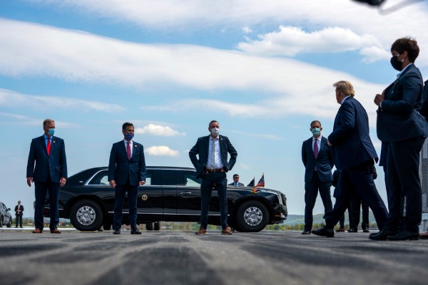 El presidente Donald Trump habla con congresistas que lo recibieron a su llegada al Aeropuerto Internacional de Lehigh Valley, en Allentown, Pensilvania. (Doug Mills/The New York Times)