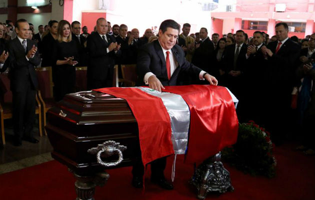 El mandatario, se encargó de depositar una bandera del Partido Colorado sobre el féretro, que además estaba cubierto de la enseña nacional de Paraguay.