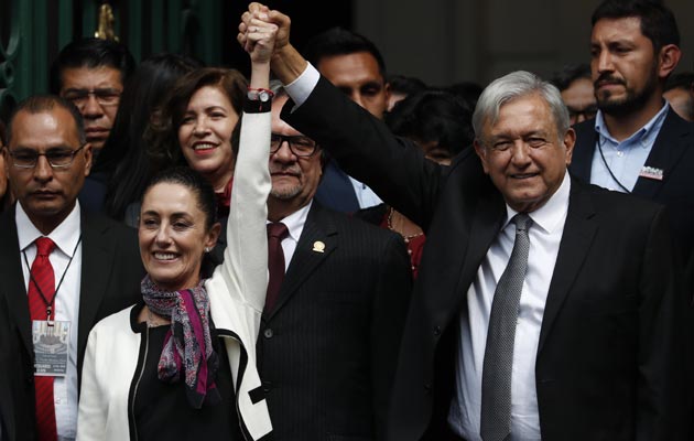 Claudia Sheinbaum, es acompañada por su mentor político, Andrés Manuel López Obrador. FOTO/AP