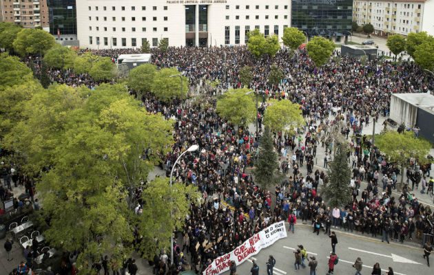 Miles de personas se manifestaron hoy de nuevo en la ciudad de Pamplona -donde se produjo la agresión- contra esa sentencia que condenó a los cinco hombres, que se hacían llamar "la Manada".España vive tercer día de protestas contra sentencia por abuso sexual en un caso que, según los jueces, no fue tipificado como agresión sexual porque no hubo violencia por parte de 5 personas que violaron a una joven de 18 años. https://t.co/WwR51Kds4I