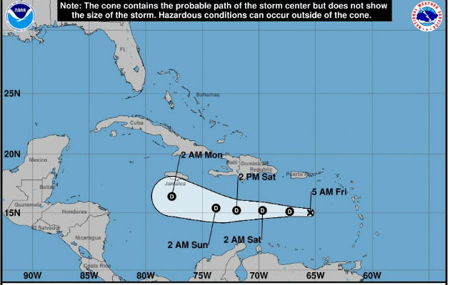 El sistema se encuentra a 190 millas al sur-suroeste de St. Croix, en las Islas Vírgenes de EE.UU., y a 380 millas al sureste de Santo Domingo (República Dominicana).